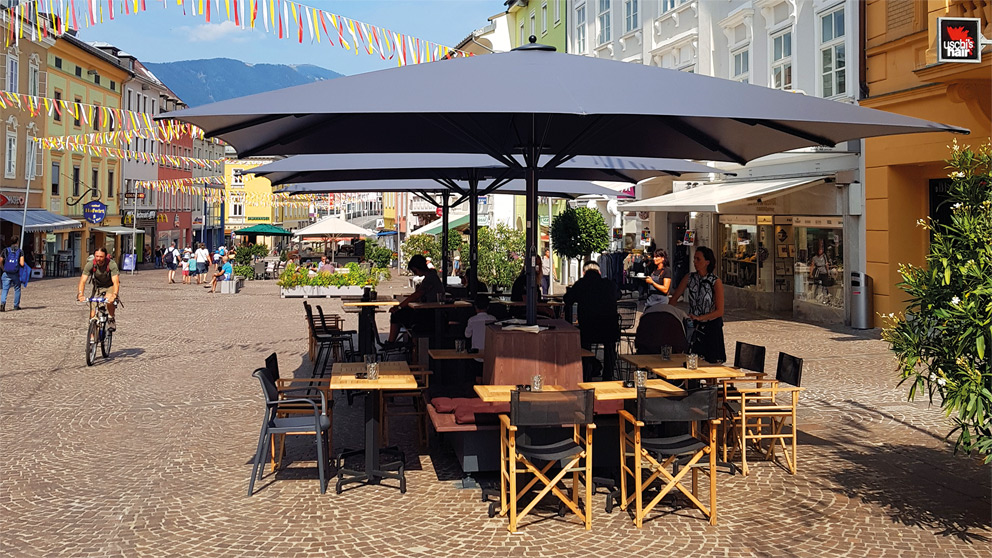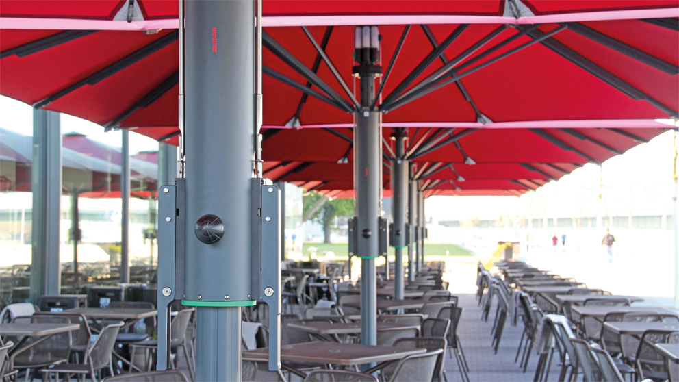 Jumbrella XL steht für "extra large" – extra groß. Die überspannte Fläche reicht von 25 m² bis 37 m². Der Jumbrella XL trotzt den höchsten Windbelastungen und zeichnet sich durch eine Vielzahl an Kombinationsmöglichkeiten und Besonderheiten seiner Zusatzausstattung aus. Die Ausführungen lassen sich individuell je nach technischen Anforderungen kombinieren.