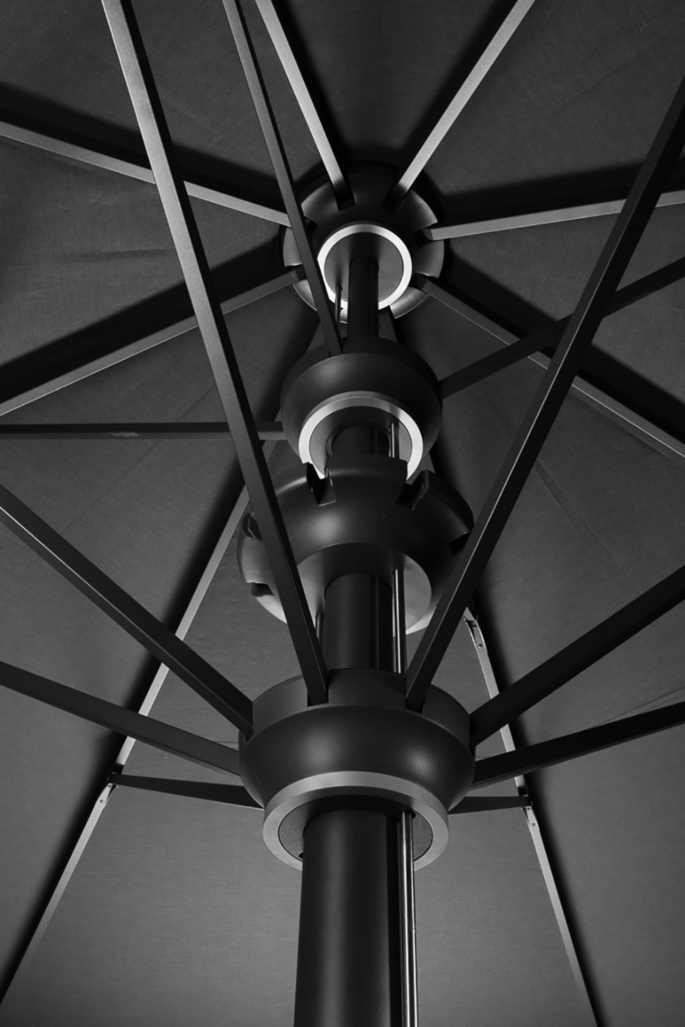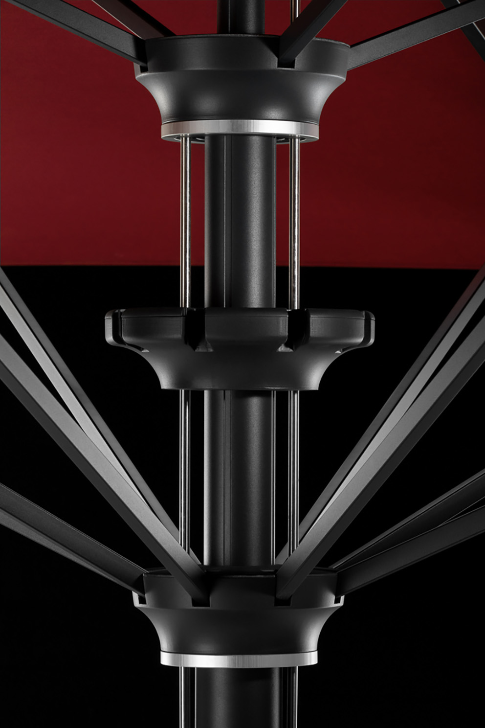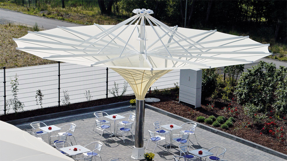 Largo ist unser technisch aufwendigstes Modell. Der Großschirm besticht durch seine außergewöhnliche und elegante Form, indem er sich wie eine Tulpe nach oben hin öffnet. Das Prinzip eines Schirms wird sprichwörtlich »auf den Kopf gestellt«. Nur die textile Bespannung und die Verkleidung der Standsäule sind sichtbar. Alle weiteren technischen Komponenten liegen nahezu unsichtbar im Schirm verborgen. Pure Schönheit der Premiumklasse. Die Standsicherheit bei Windgeschwindigkeiten bis max. 130 km/h wird garantiert.