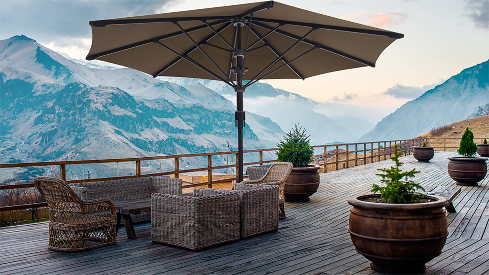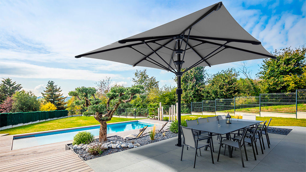 Der Freiarmschirm Jumbrella outSide erzielt seine optische Leichtigkeit durch den seitlich stehenden Mast. Dadurch erhält das schattenspendende Textil eine Alleinstellung ohne weitere Ablenkung. Die technische Robustheit für die Stabilisierung tritt an die Seite und somit in den Hintergrund. Die Zusatzausstattungen erweitern das funktionale Design mit noch mehr Komfort und Gemütlichkeit.