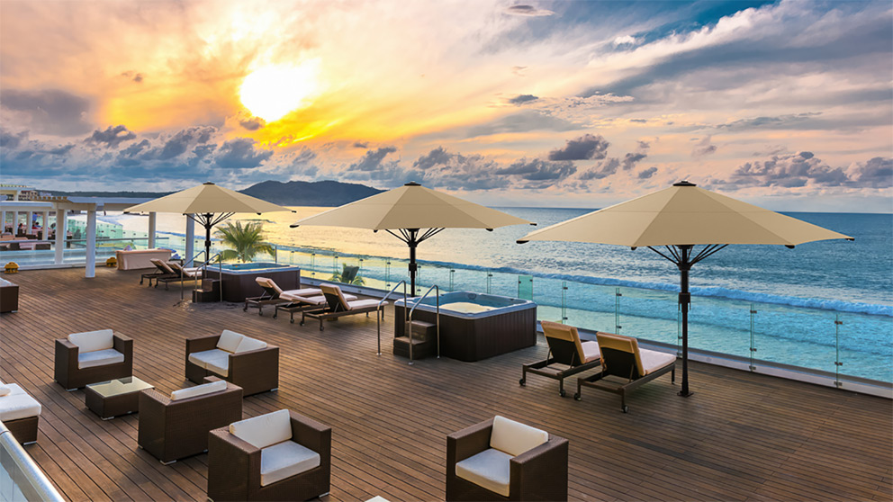 Die hochwertigen Großschirme von Bahama stehen charakteristisch sowohl für technische Attribute wie Kompaktheit, Haltbarkeit und Windstabilität, als auch für ästhetische Komponenten wie Form- und Materialschönheit. Entdecken Sie die Möglichkeiten einer verlängerten Freiluftsaison. Bei Wind und Wetter.